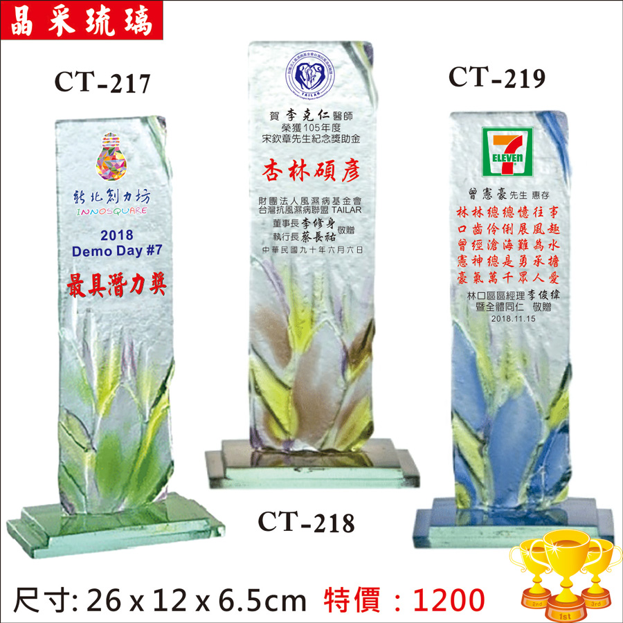 首頁 精選商品介紹 特價款獎盃獎牌 CT-217晶彩琉璃獎座 CT-217 CT-217晶彩琉璃獎座 售價 NT$ 2,500 優惠價 NT$ 1,200 型號:CT-217 . CT-218 . CT-219 ※ 晶彩琉璃獎座※ 尺寸:260*120mm NT : 1200字可上色 另+100元 彩印+200元 (請另下單補價差連結補足差額,也可來電或加LINE下單訂購) 1699912