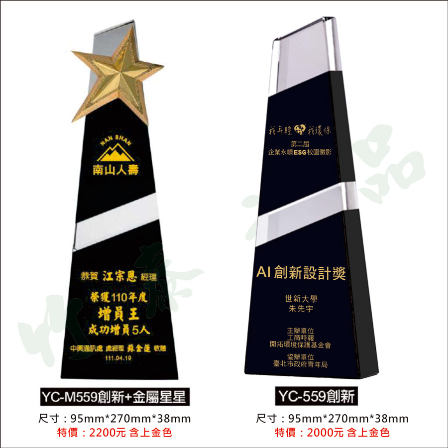 首頁 精選商品介紹 水晶獎盃獎牌-1 YC-559 水晶獎座 YC-559 YC-559 水晶獎座 售價 NT$ 3,000 優惠價 NT$ 2,100 型號:YC-559 ※創新※ 尺寸:95mm*270mm*38mm NT : 2100型號:YC-M559 ※創新+金屬星※ 尺寸:95mm*270mm*38mm NT : 2300免費上金字 彩印+200元(+金屬星,請另下單補價差連結,也可來電或加LINE下單訂購) 1699940